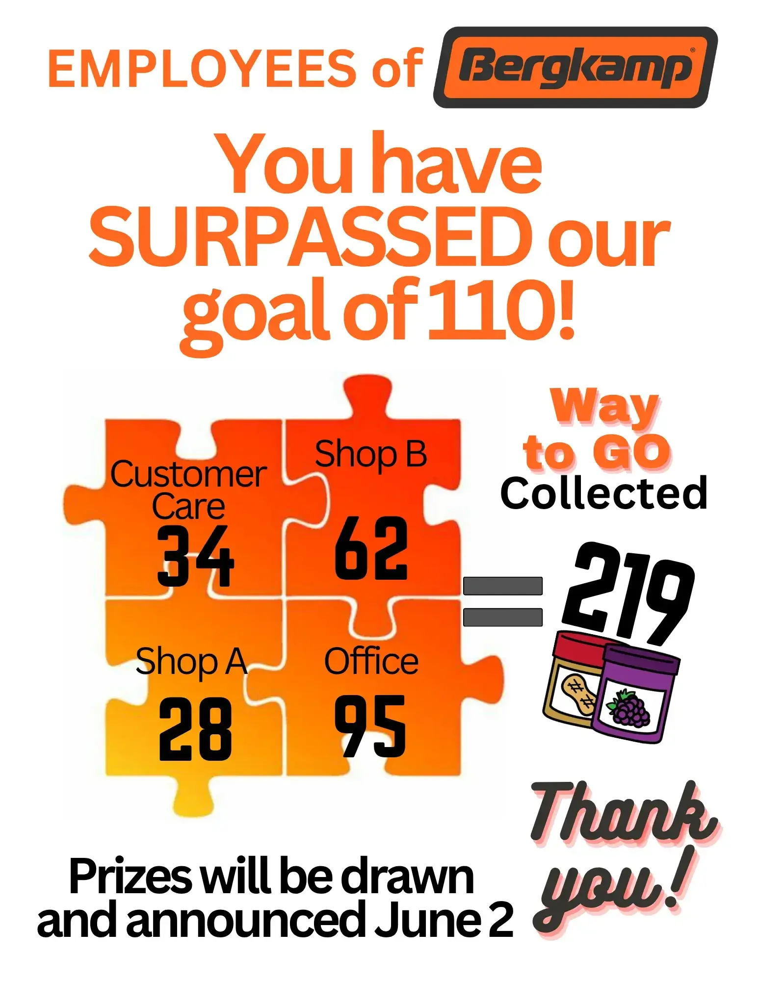 For the past few years Bergkamp has been collecting Peanut Butter and Jelly. Every year our generous employees answer the call with stacks of food items to support our community. This year’s goal was 110 jars of peanut butter and jelly. The total collection was 219 jars which surpassed the goal. The 219 items included cash donations valued at $135.